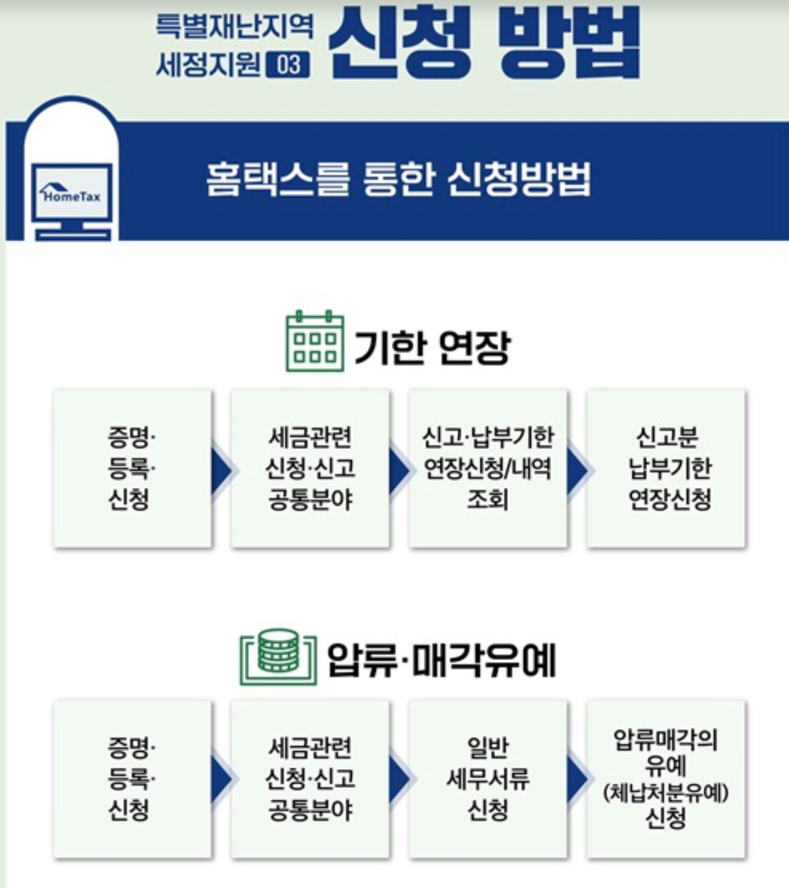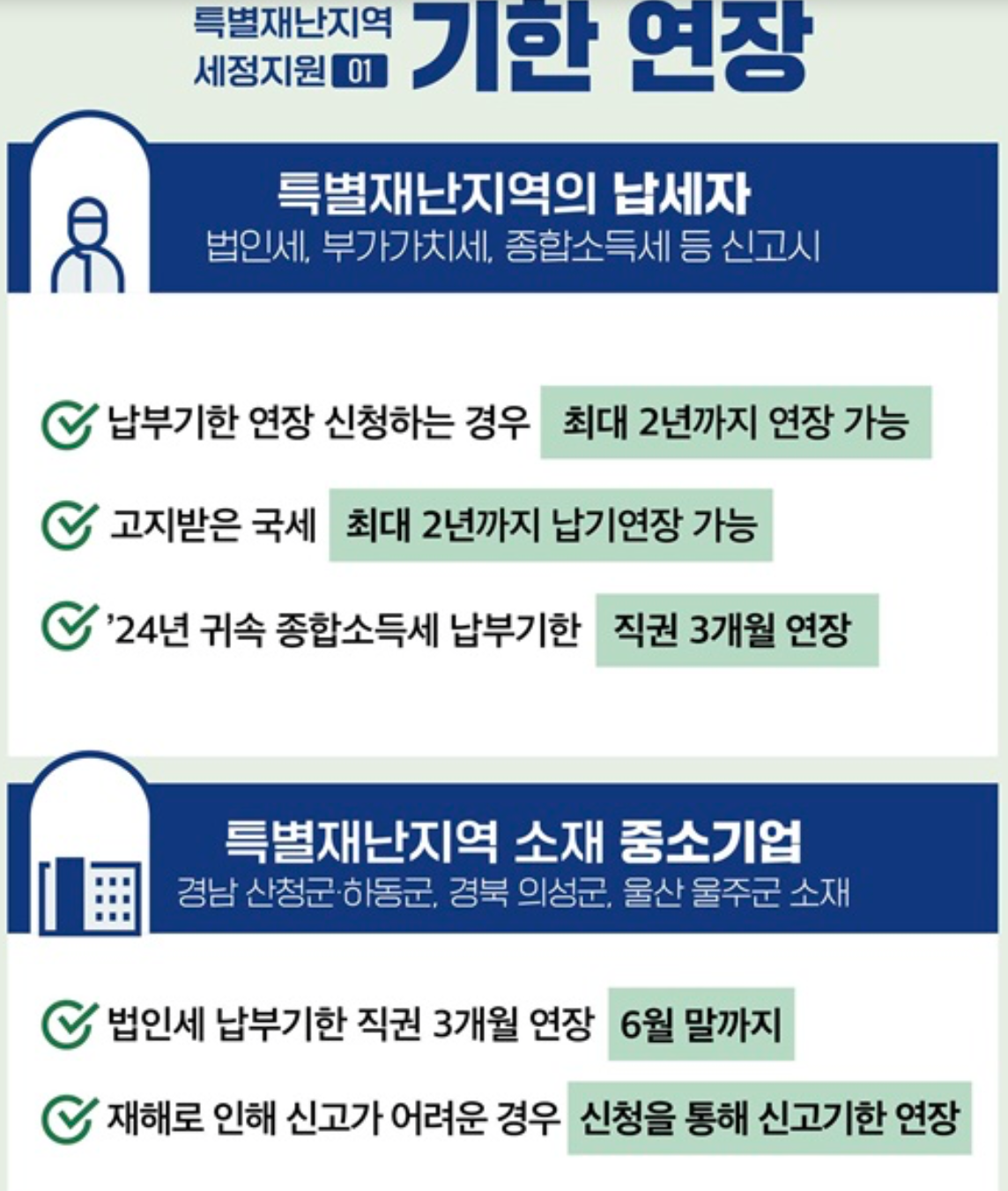특별재난지역 내 주민과 기업들은 국세 및 지방세 신고와 납부 기한이 연장됩니다.