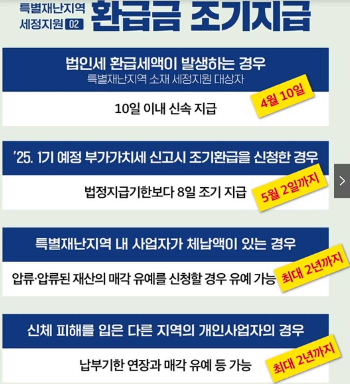 특별재난지역으로 지정된 지역 주민들과 기업들에게 아래와 같은 세정지원이 제공됩니다.