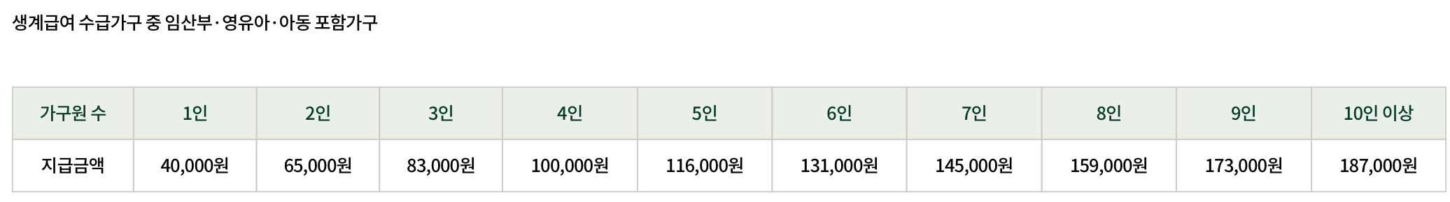 : 가구원 수에 따라 월 최대 10만 원까지 지원됩니다. 예를 들어, 4인 가구의 경우 월 10만 원이 지급됩니다.