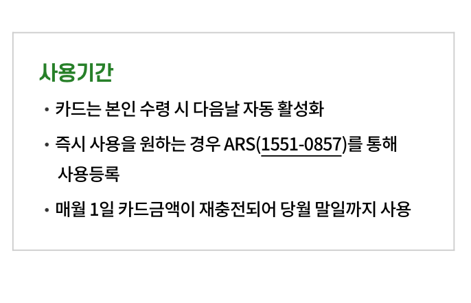 : 전자바우처 카드 형태로 지급되며, 매월 1일에 해당 월의 지원 금액이 충전됩니다.